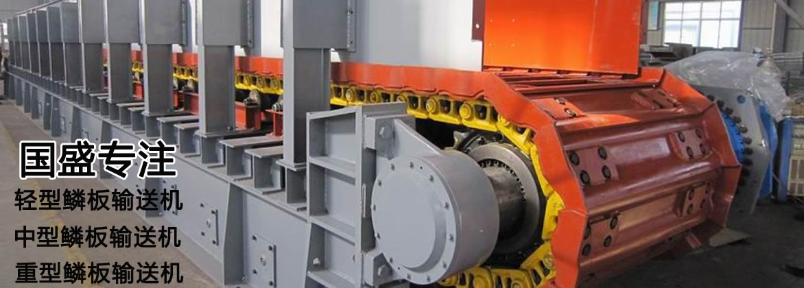 鱗板式輸送機采用節(jié)距高強度模鍛鏈條為牽引件,兩根鏈條繞過安裝在機體頭部的一對驅(qū)動鏈輪和機體尾部的一對張緊輪聯(lián)成封閉形回路,在兩排鏈條的每個鏈節(jié)上裝配了相互交迭的、重型結(jié)構(gòu)的輸送槽而成為一個連續(xù)的能夠運載物料的輸送線路。其自重和物料的重量由安裝在機體上的多排支重輪、鏈托輪和滑道梁支承。傳動系統(tǒng)經(jīng)交流變頻調(diào)速電動機聯(lián)接減速機,再由漲套與驅(qū)動裝置直聯(lián)驅(qū)動運載機構(gòu)低速運行。將尾部料倉卸入的物料沿輸送線路運至機體的前方排出,通過鏈條的傳動將鱗板上的物料輸送到卸料處,實現(xiàn)向下方的工作機械連續(xù)均勻輸送的目的。