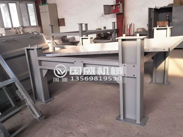 篩板材質(zhì)為304條縫篩板,篩孔為5mm,采用條縫橫向布局,2臺(tái)振動(dòng)電機(jī)型號(hào)為YZS-20-6,電機(jī)功率為1.5kw,篩機(jī)安裝傾角為5°,由于污泥需要進(jìn)行清洗,因此脫水篩上方建議安裝沖洗管道,篩機(jī)主體和積水槽之間的材質(zhì)采用帆布軟連接,沖洗管道及布料器和篩機(jī)無(wú)硬連接,支撐架的作用是為了支撐沖洗管管路及布料器,上蓋和篩機(jī)采用快開(kāi)箱口。